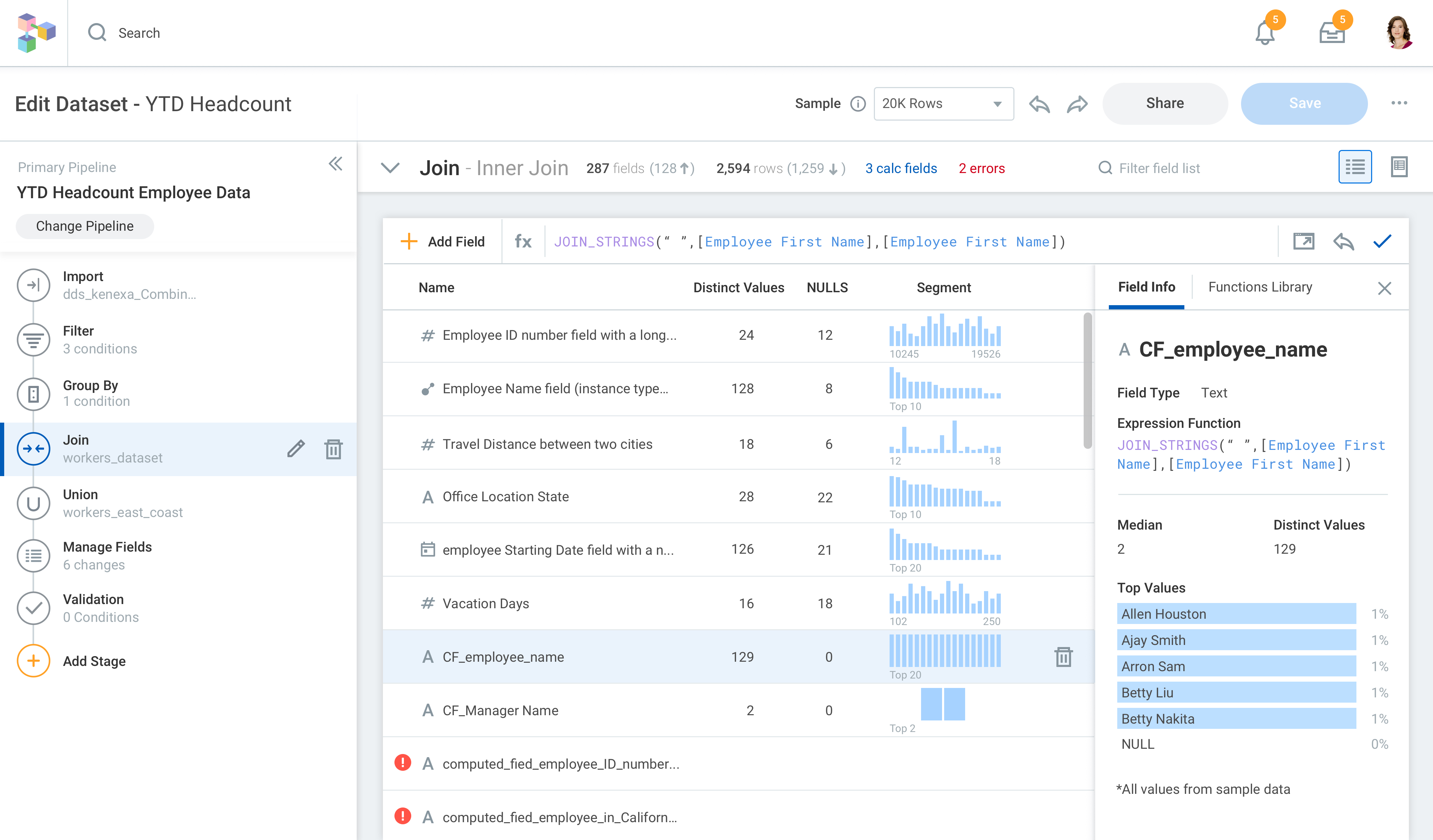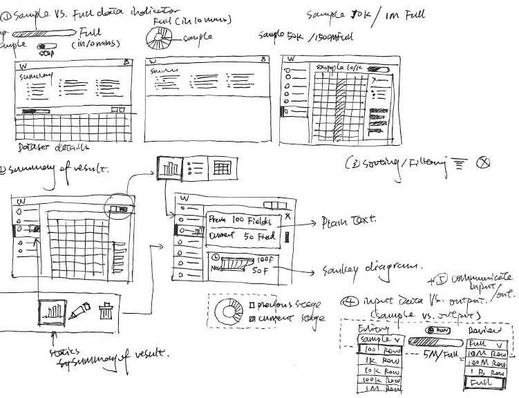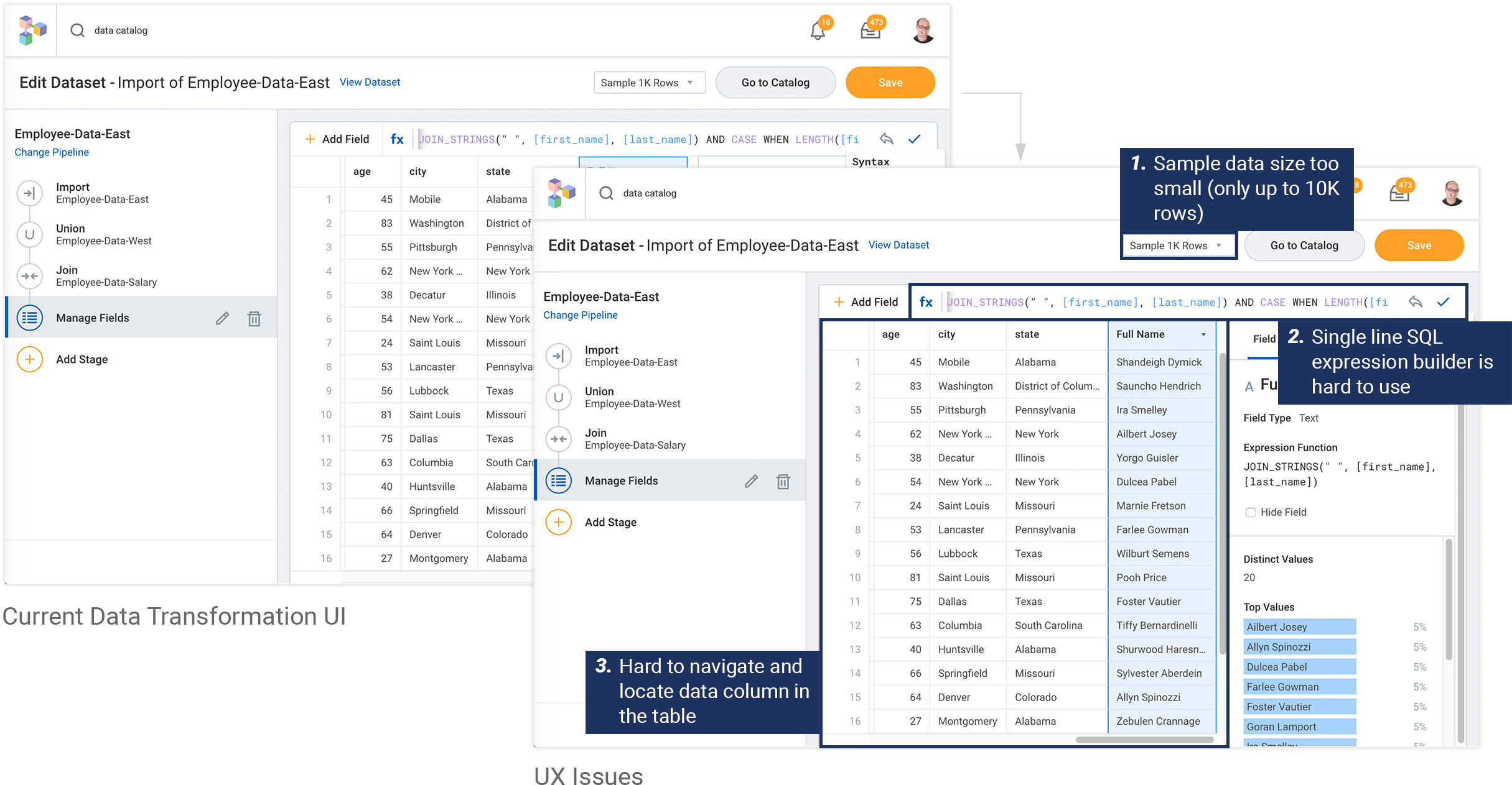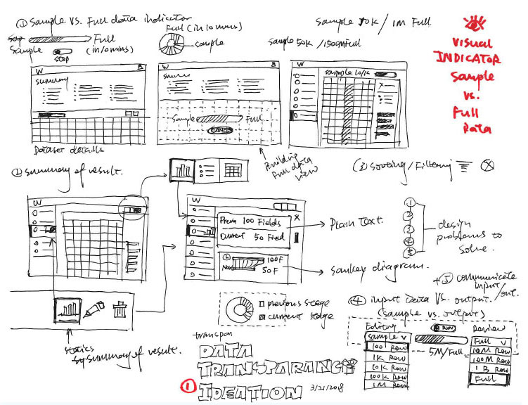 The current data transformation UI has three major UX issues: 1.Data Sample (data rows) is not enough and biased; 2.SQL Expression builder is a single-line interface; 3.Real-estate of sample data table is hard to navigate.
