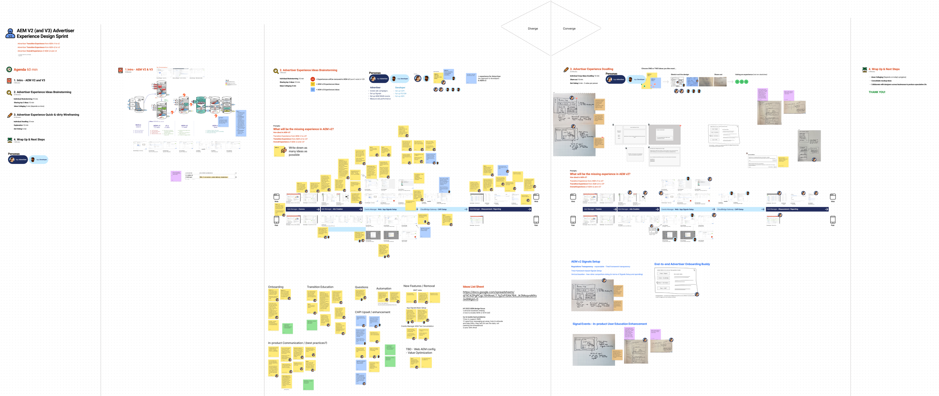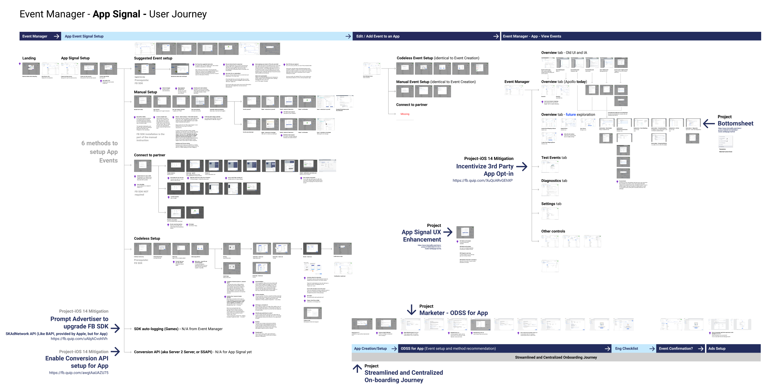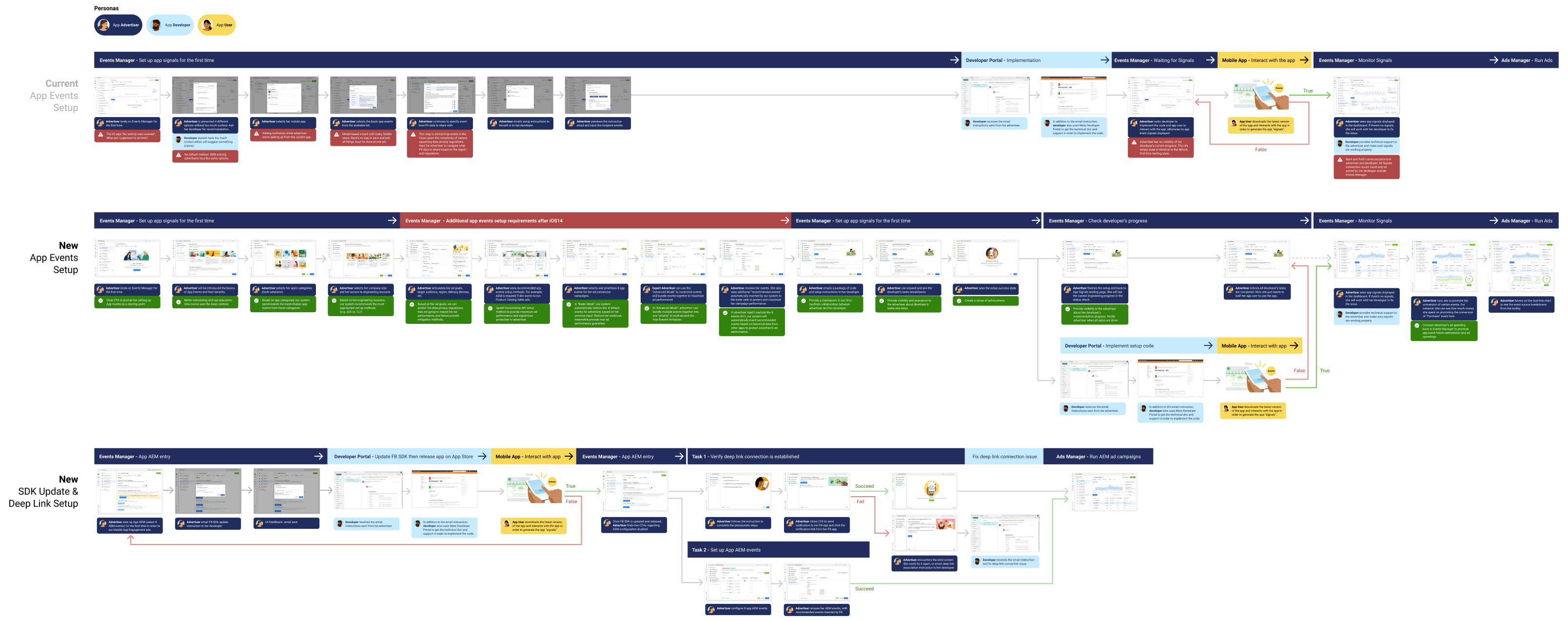 In order to understand the full end-to-end advertiser experience, I captured all the steps and methods of how advertisers set up app signals, and pieced the full user flow together. From there, I identified the major bottlenecks and pain points.