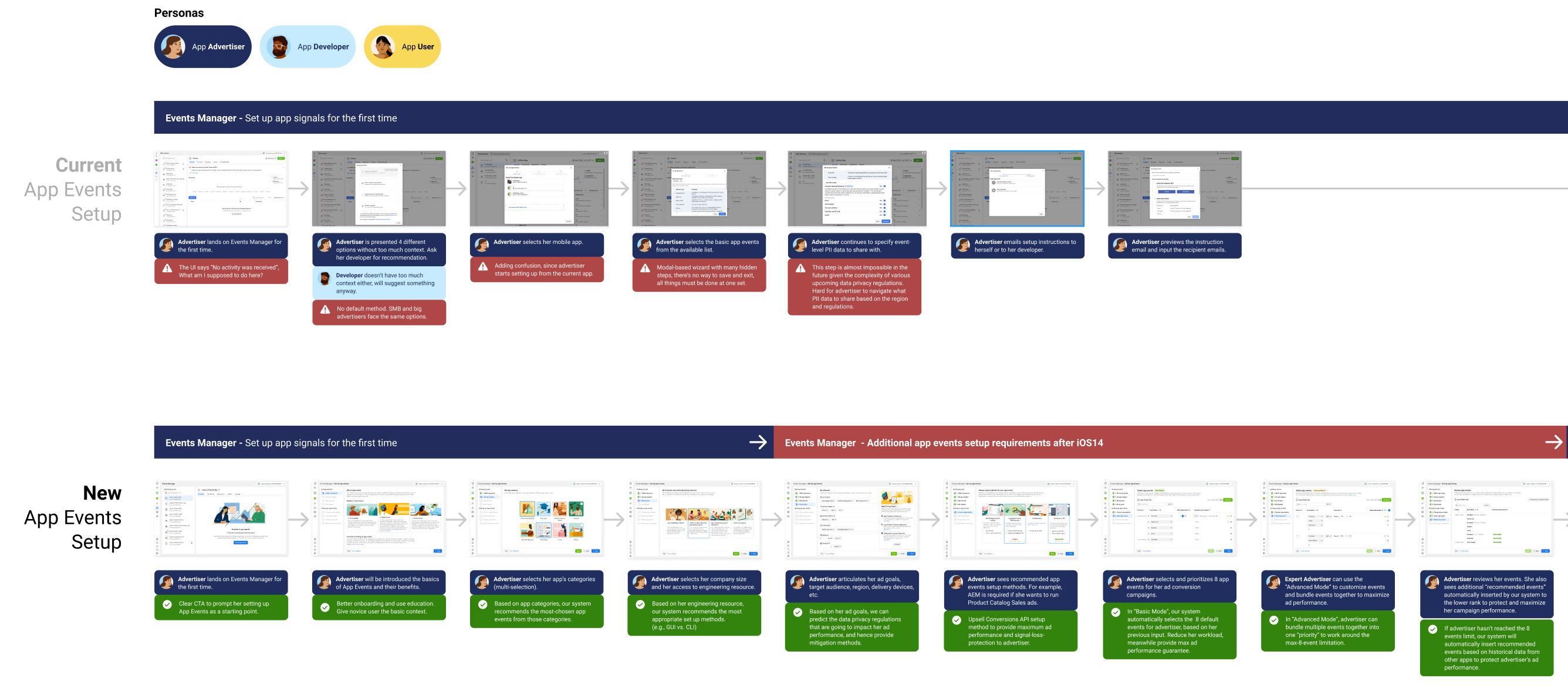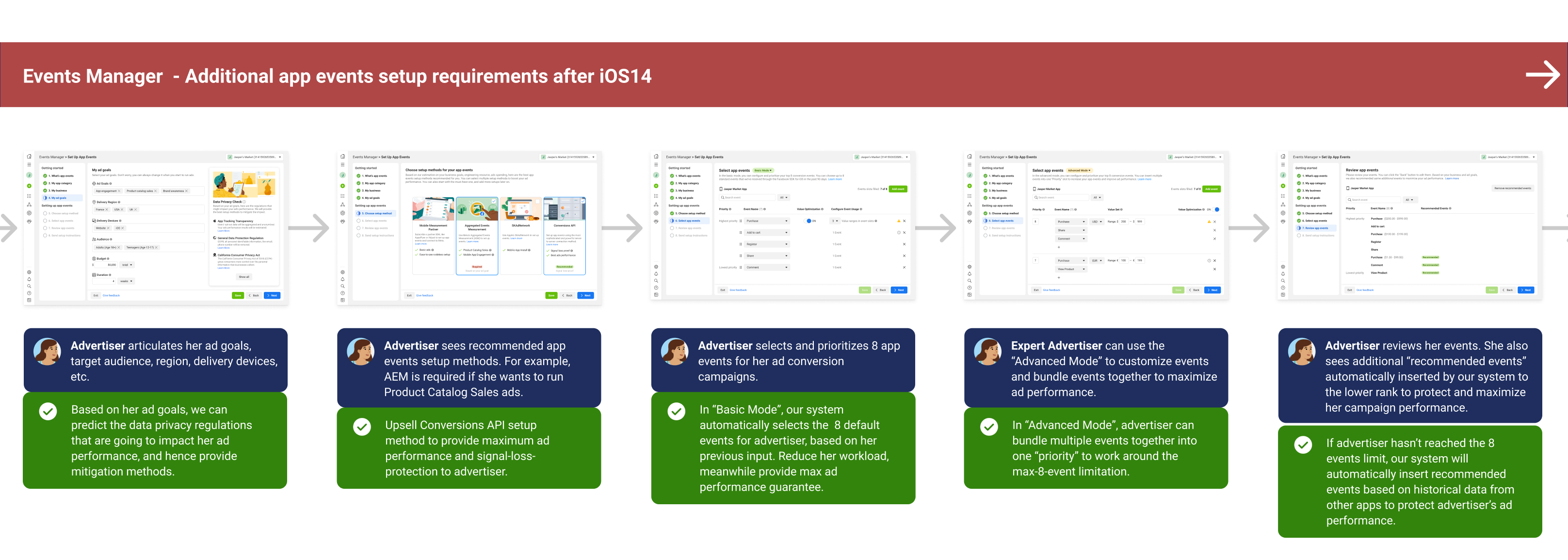 The most important step in this process is to always incorporate personas (advertiser & developer) into your end-to-end user journey UI designs. I used the job-to-be-done advertiser storytelling framework here to describe advertiser's task in each UI.
